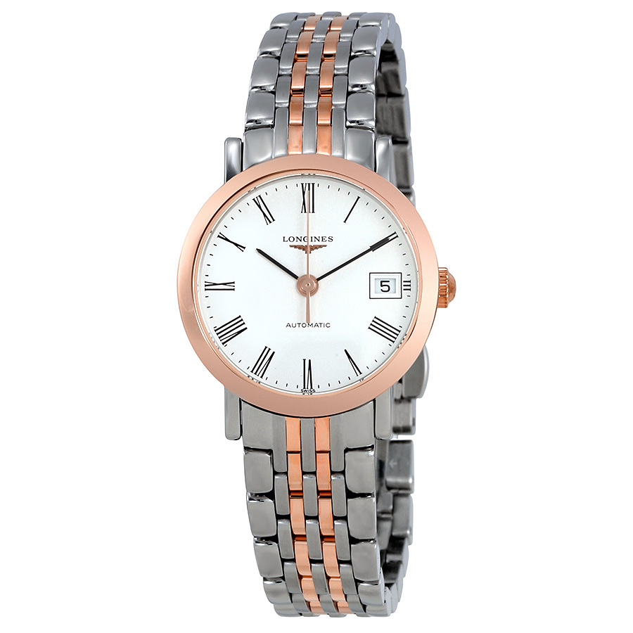Silver-tone stainless steel case with a two-tone (silver-tone and rose gold PVD) stainless steel bracelet. Fixed rose gold PVD stainless steel bezel. White dial with black hands and Roman numeral hour markers. Minute markers around the outer rim. Dial Type: Analog. Date display at the 3 o'clock position. Longines Calibre L595/592 Automatic movement, based upon ETA 2000-1, containing 20 Jewels, bitting at 28800 vph, and has a power reserve of approximately 40 hours. Scratch resistant sapphire crystal. Pull / push crown. Transparent case back. Round case shape, case size: 25.5 mm, case thickness: 8 mm. Band width: 13 mm. Deployment clasp. Water resistant at 30 meters / 100 feet. Functions: date, hour, minute, second. Elegant Series. Luxury watch style. Watch label: Swiss Made. Longines Elegant Automatic White Dial Ladies Watch L43095117.