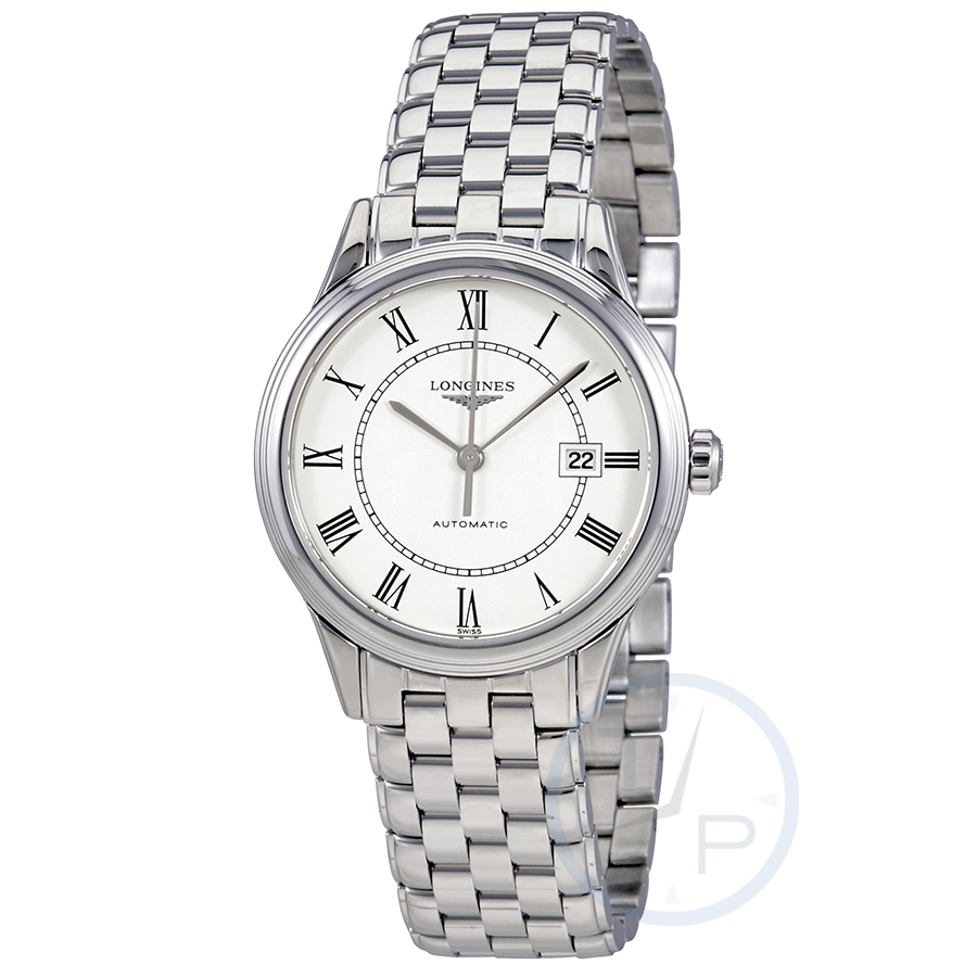 Stainless steel case with a stainless steel bracelet. Fixed stainless steel bezel. White dial with silver-tone hands and Roman numeral hour markers. Minute markers. Dial Type: Analog. Date display at the 3 o'clock position. Longines calibre L592 automatic movement with a 40-hour power reserve. Scratch resistant sapphire crystal. Pull / push crown. Transparent case back. Round case shape. Case size: 30 mm. Band width: 15 mm. Fold over clasp with a push button release. Water resistant at 30 meters / 100 feet. Functions: date, hour, minute, second. Luxury watch style. Watch label: Swiss Made. Longines Flagship Automatic White Dial Ladies Watch L4.374.4.21.6.
