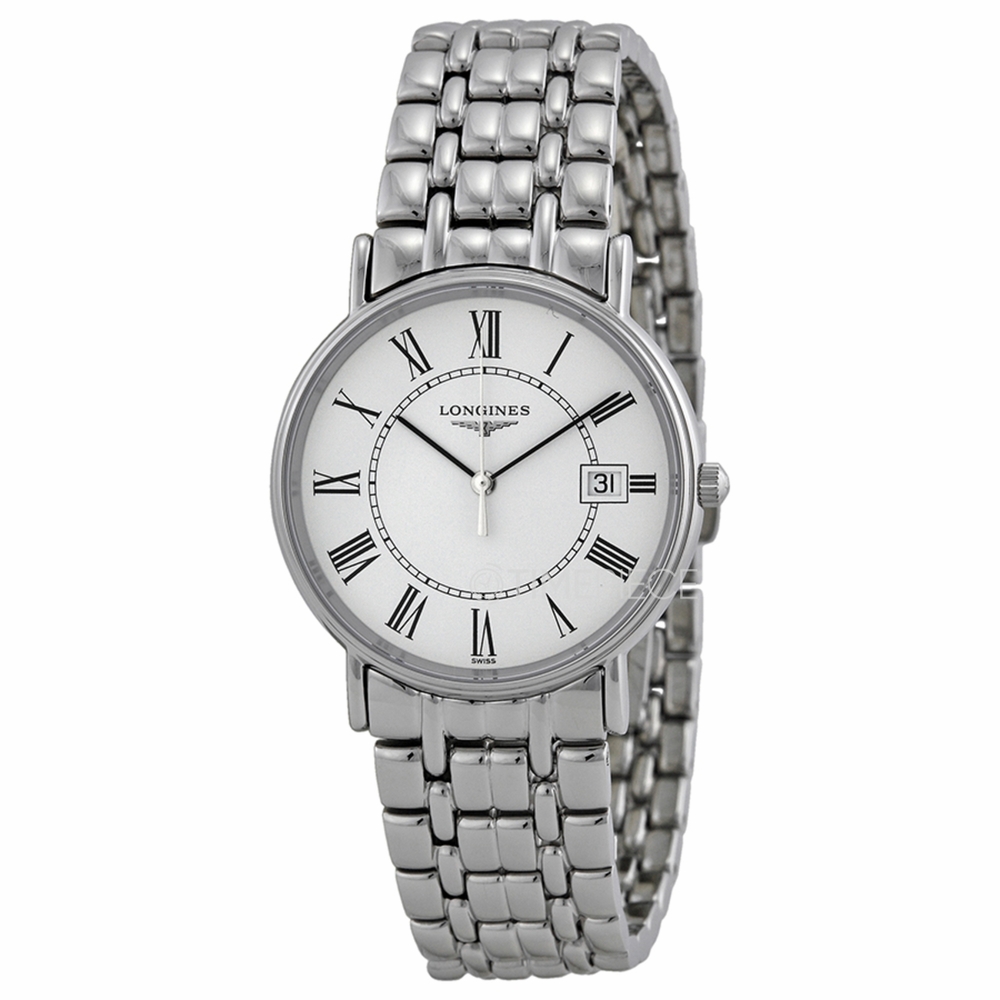 Stainless steel case with a stainless steel bracelet. Fixed stainless steel bezel. White dial with black hands and Roman numeral hour markers. Minute markers around the outer rim. Dial Type: Analog. Date displays at the 3 o'clock position. Quartz movement. Scratch resistant sapphire crystal. Pull / push crown. Solid case back. Case diameter: 32 mm. Round case shape. Band length: 8 inches. Hidden folding clasp. Water resistant at 30 meters / 100 feet. Functions: date, hour, minute, second. Casual watch style. Watch label: Swiss. Item Variations: L4 720 4 11 6, L4-720-4-11-6, L4/720/4/11/6, L47204116. Longines La Grande Classique Presence Mens Watch L47204116.
