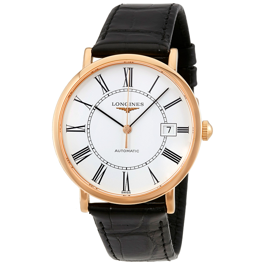 18kt rose gold case with a black (alligator) leather strap. Fixed rose 18kt gold bezel. White dial with black hands and Roman numeral hour markers. Minute markers around an inner ring. Dial Type: Analog. Date display at the 3 o'clock position. Longines calibre L619/888 automatic movement, based upon ETA 2892, containing 21 Jewels, bitting at 25200 vph, and has a power reserve of approximately 64 hours. Scratch resistant sapphire crystal. Pull / push crown. Transparent case back. Round case shape. Case size: 37 mm. Case thickness: 7 mm. Band width: 19 mm. Tang clasp. Water resistant at 30 meters / 100 feet. Functions: date, hour, minute, second. Elegant Series. Luxury watch style. Watch label: Swiss Made. Item Variations: L47878110. Longines Elegant Automatic 18kt Rose Gold 37 mm Unisex Watch L4.787.8.11.0.