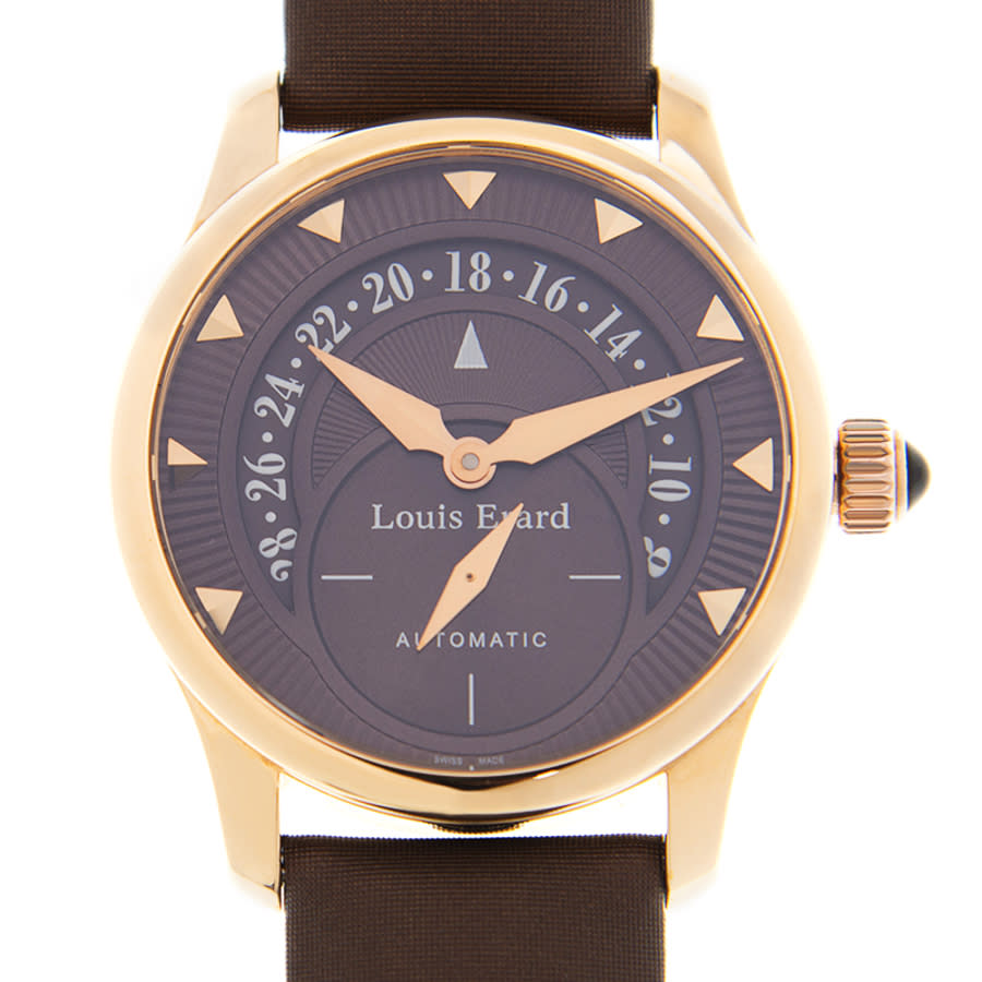 Rose gold-tone 18kt rose gold case with a brown leather strap. Fixed rose gold-tone 18kt rose gold bezel. Brown dial with rose gold-tone hands and index hour markers. Dial Type: Analog. Date display at the 12 o'clock position. Automatic movement. Scratch resistant sapphire crystal. Solid case back. Round case shape, case size: 36.5 mm. Buckle clasp. Water resistant at 30 meters / 100 feet. Functions: date, hour, minute, second. Additional Info: original box, international warranty card, manual (complete accessories). Emotion Series. Luxury watch style. Watch label: Swiss Made. Louis Erard Emotion Automatic Brown Dial Mens Watch 92600OE13.BAS90.