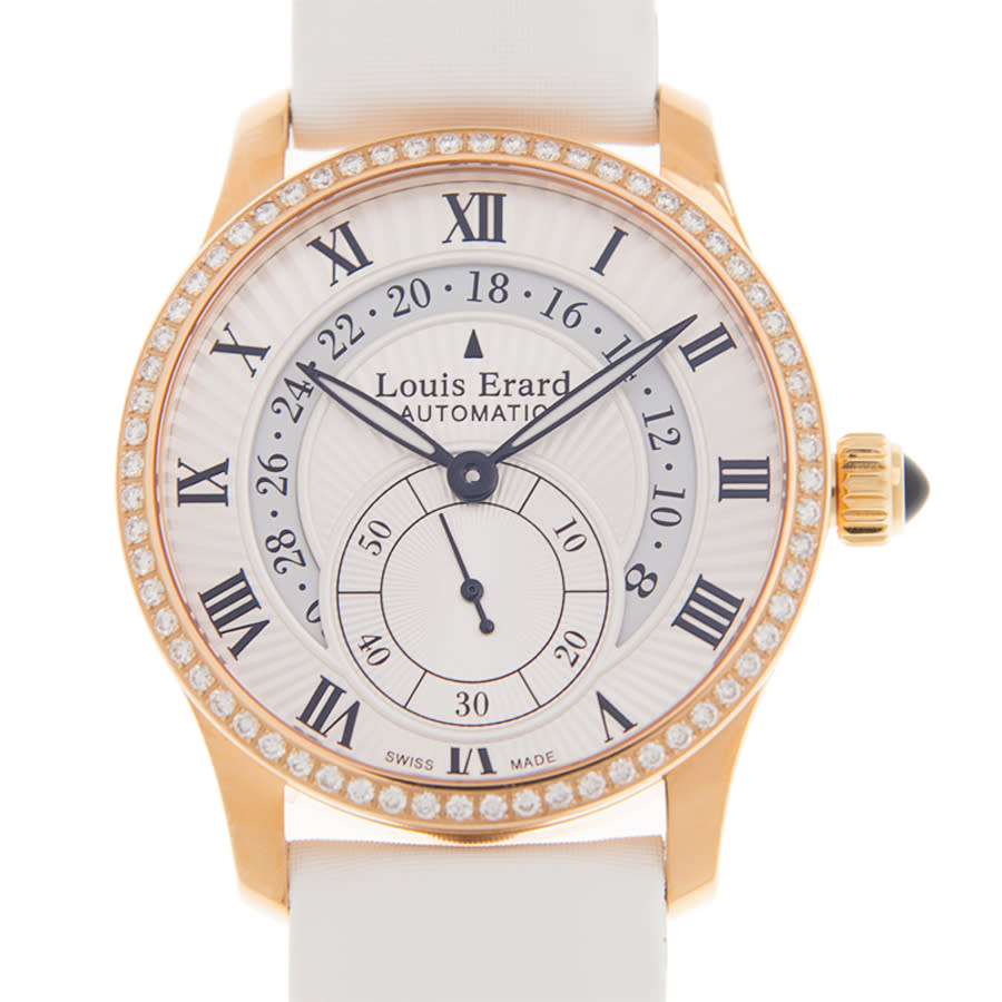 18kt rose gold case with a white satin strap. Fixed 18kt rose gold bezel set with diamonds. White dial with black hands and Roman numeral hour markers. Dial Type: Analog. Luminescent hands. Date display at the 12 o'clock position. 60 seconds sub-dial. Automatic movement. Scratch resistant sapphire crystal. Solid case back. Round case shape. Case size: 36.5 mm. Case thickness: 9.84 mm. Tang clasp. Water resistant at 30 meters / 100 feet. Functions: date, hour, minute, second, 24 hour. Additional Info: original box, manual (complete accessories). Emotion Series. Luxury watch style. Watch label: Swiss Made. Louis Erard Emotion Automatic Diamond White Dial Mens Watch 92600OS21.BAS93.
