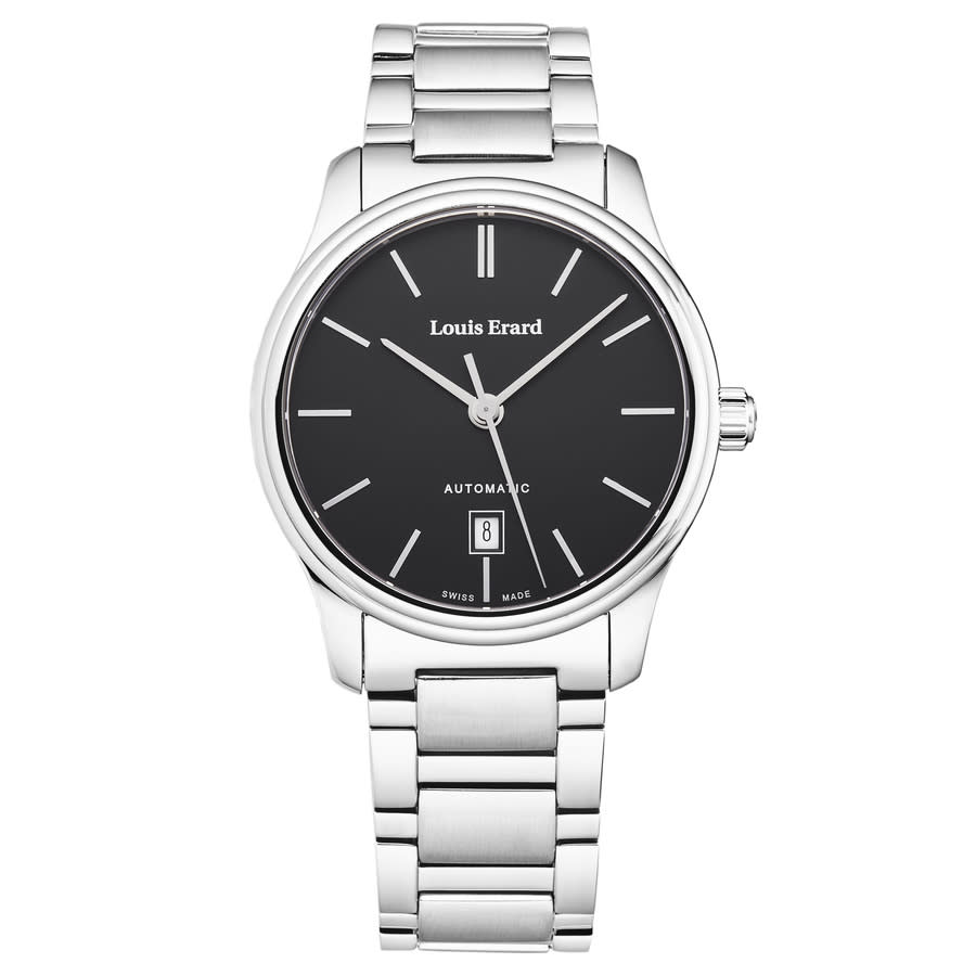 Silver-tone stainless steel case and bracelet. Fixed silver-tone stainless steel bezel. Black dial with silver-tone hands and index hour markers. Dial Type: Analog. Date display at the 6 o'clock position. Automatic movement with a 38-hour power reserve. Scratch resistant sapphire crystal. Pull / push crown. Transparent see through case back. Round case shape, case size: 40 mm, case thickness: 11.5 mm. Band width: 21 mm, band length: 8 inches. Deployment clasp. Water resistant at 50 meters / 165 feet. Functions: date, hour, minute, second. Heritage Series. Luxury watch style. Watch label: Swiss Made. Louis Erard Heritage Automatic Black Dial Mens Watch 67278AA12.BMA05.