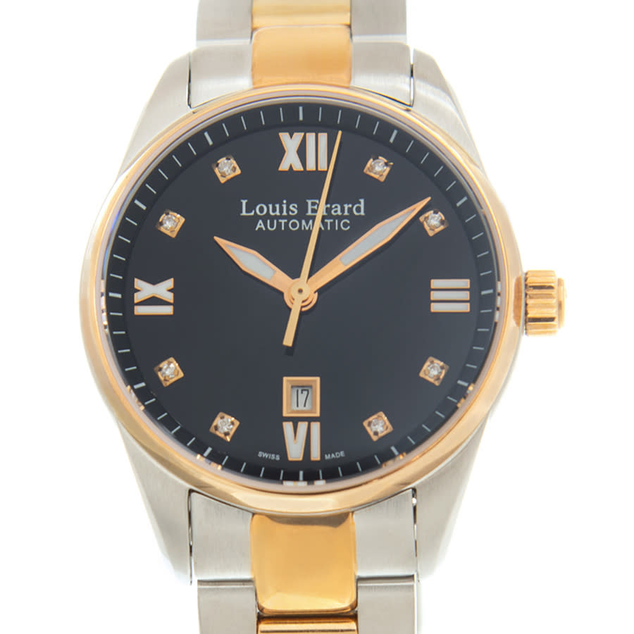 Silver-tone stainless steel case with a two-tone (silver-tone and yellow gold-tone) stainless steel and 18kt yellow gold bracelet. Fixed yellow gold-tone stainless steel bezel. Black dial with yellow gold-tone hands and diamond hour markers. Minute markers around the outer rim. Dial Type: Analog. Luminescent hands and markers. Date display at the 6 o'clock position. Automatic movement. Scratch resistant sapphire crystal. Transparent see through case back. Round case shape, case size: 30 mm. Deployment with push button release clasp. Water resistant at 50 meters / 165 feet. Functions: date, hour, minute, second. Additional Info: original box, international warranty card, manual (complete accessories). Heritage Series. Luxury watch style. Watch label: Swiss Made. Louis Erard Heritage Automatic Diamond Black Dial Ladies Watch 20100AB32.BMA20.
