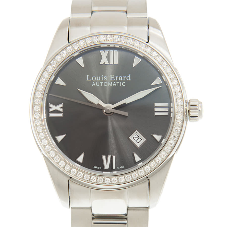 Silver-tone stainless steel case and bracelet. Fixed silver-tone stainless steel bezel. Grey dial with silver-tone hands and Roman numeral hour markers. Minute markers around the outer rim. Dial Type: Analog. Luminescent hands and markers. Date display between 4 and 5 o'clock position. Automatic movement. Scratch resistant sapphire crystal. Transparent see through case back. Round case shape, case size: 40 mm. Deployment with push button release clasp. Water resistant at 50 meters / 165 feet. Functions: date, hour, minute, second. Additional Info: original box, international warranty card, manual (complete accessories). Heritage Series. Luxury watch style. Watch label: Swiss Made. Louis Erard Heritage Automatic Grey Dial Mens Watch 69101SE03.BMA19.