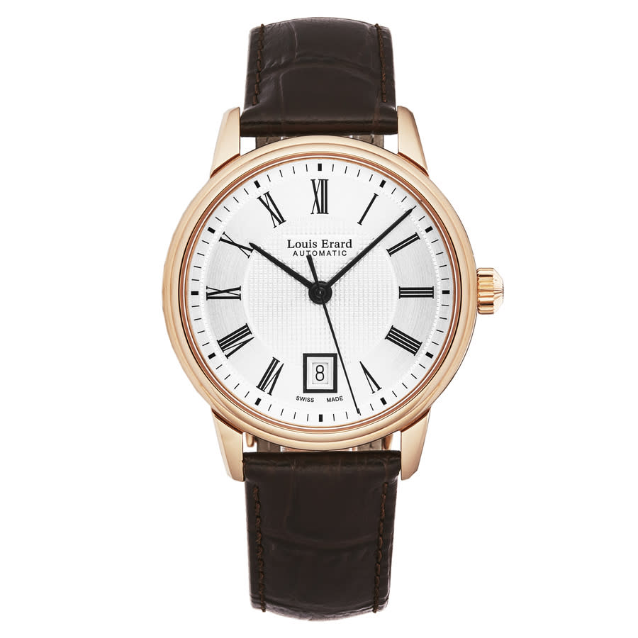 Rose gold-tone stainless steel case with a brown leather strap. Fixed rose gold-tone stainless steel bezel. Silver-tone dial with black hands and Roman numeral hour markers. Minute markers around the outer rim. Dial Type: Analog. Date display at the 6 o'clock position. Automatic movement. Scratch resistant sapphire crystal. Pull / push crown. Transparent case back. Round case shape, case size: 40 mm, case thickness: 10 mm. Band width: 20 mm, band length: 8 inches. Deployment with push button release clasp. Water resistant at 50 meters / 165 feet. Functions: date, hour, minute, second. Heritage Series. Luxury watch style. Watch label: Swiss Made. Louis Erard Heritage Automatic Silver Dial Mens Watch 69266PR21.BRC80.