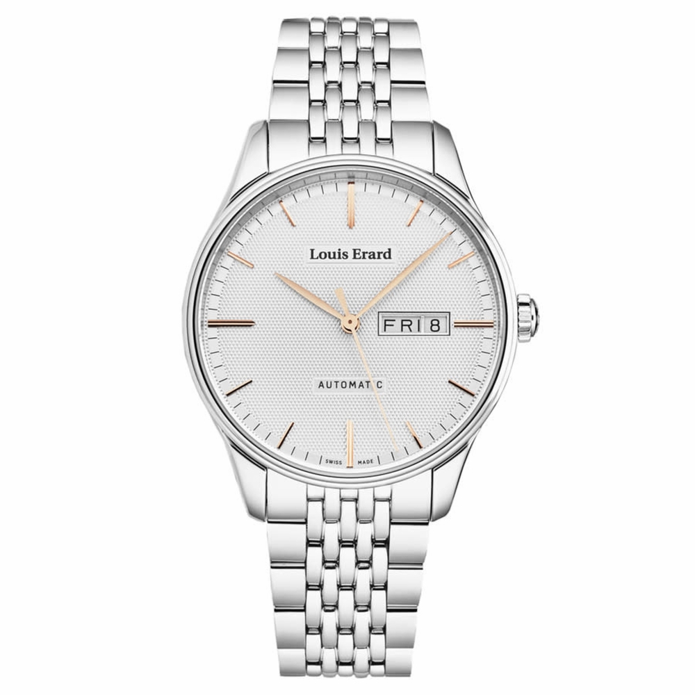 Silver-tone stainless steel case and bracelet. Fixed silver-tone stainless steel bezel. Silver-tone dial with rose gold-tone hands and index hour markers. Minute markers around the outer rim. Dial Type: Analog. Day of the week and date display at the 3 o'clock position. Automatic movement. Scratch resistant sapphire crystal. Pull / push crown. Transparent case back. Round case shape, case size: 41 mm, case thickness: 12 mm. Band width: 20 mm, band length: 8 inches. Deployment with push button release clasp. Water resistant at 50 meters / 165 feet. Functions: date, day, hour, minute, second. Heritage Series. Luxury watch style. Watch label: Swiss Made. Louis Erard Heritage Automatic Silver Dial Mens Watch 72288AA31.BMA88.
