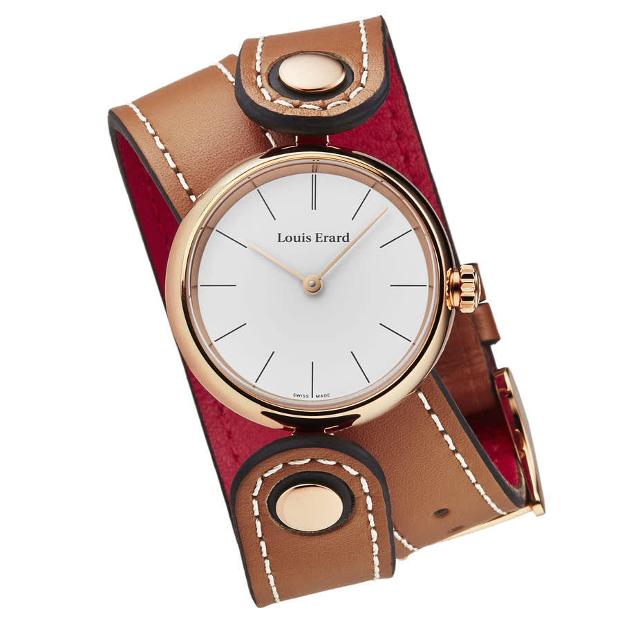 Rose gold-tone stainless steel case with a brown leather strap. Fixed rose gold-tone stainless steel bezel. White dial with rose gold-tone hands and index hour markers. Dial Type: Analog. Quartz movement. Scratch resistant sapphire crystal. Pull / push crown. Solid case back. Round case shape, case size: 30 mm, case thickness: 7.5 mm. Band width: 18 mm, band length: 7 inches. Tang clasp. Water resistant at 50 meters / 165 feet. Functions: hour, minute. Romance Series. Luxury watch style. Watch label: Swiss Made. Louis Erard Romance Quartz White Dial Ladies Watch 19830PR01.SETPR1.