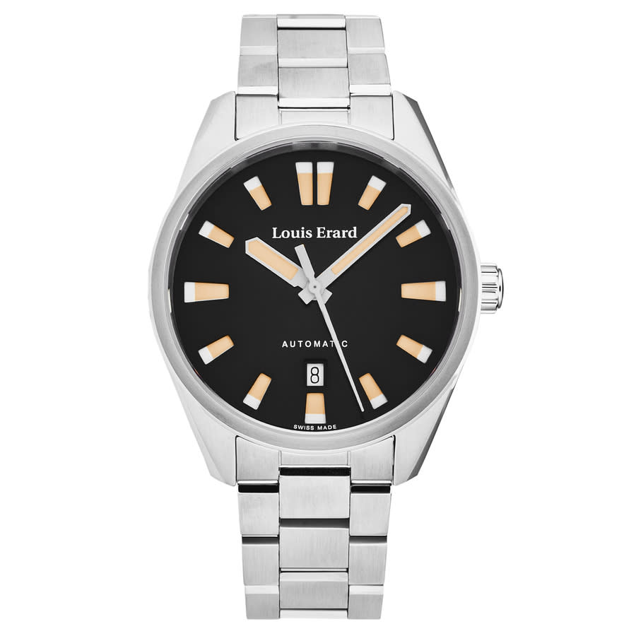 Stainless steel case with a stainless steel bracelet. Fixed stainless steel bezel. Black dial with luminous silver-tone hands and index hour markers. Dial Type: Analog. Luminescent hands and markers. Date display above the 6 o'clock position. Automatic movement. Scratch resistant sapphire crystal. Pull / push crown. Transparent case back. Round case shape. Case size: 42 mm. Case thickness: 11.5 mm. Band width: 20 mm. Band length: 8 inches. Deployment with push button release clasp. Water resistant at 100 meters / 330 feet. Functions: date, hour, minute, second. Sportive Series. Luxury watch style. Watch label: Swiss Made. Louis Erard Sportive Automatic Black Dial Mens Watch 69108AA02.BMA48.