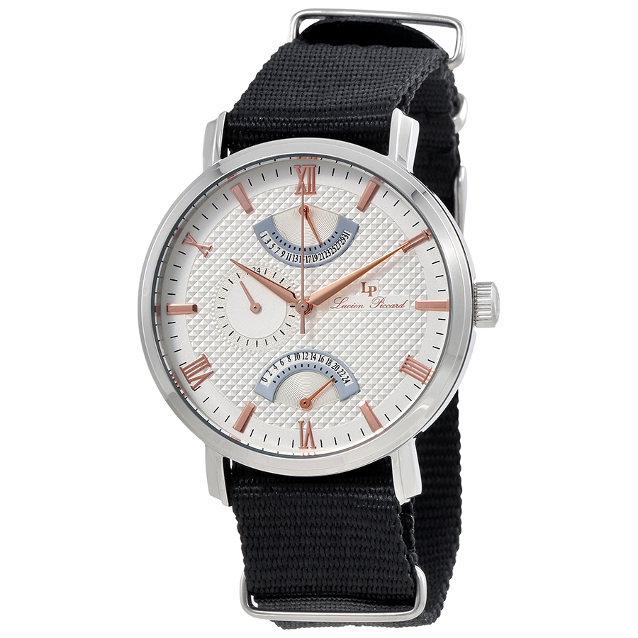 Silver-tone stainless steel case with a black textile strap. Fixed silver-tone stainless steel bezel. Silver dial with rose gold-tone alpha-style shape hands and Roman numeral and index hour markers. Minute markers around the outer rim. Dial Type: Analog. 24 hours. retrograde date and 24 hours (dual time) subdials. Quartz movement. Scratch resistant mineral crystal. Pull / push crown. Solid case back. Round case shape, case size: 44 mm, case thickness: 13 mm. Tang clasp. Water resistant at 50 meters / 165 feet. Functions: date, hour, minute, second, 24 hours, and dual time. Casual watch style. Lucien Piccard Verona Silver Dial Dual Time Mens Watch 10340-02S-RA-NS.