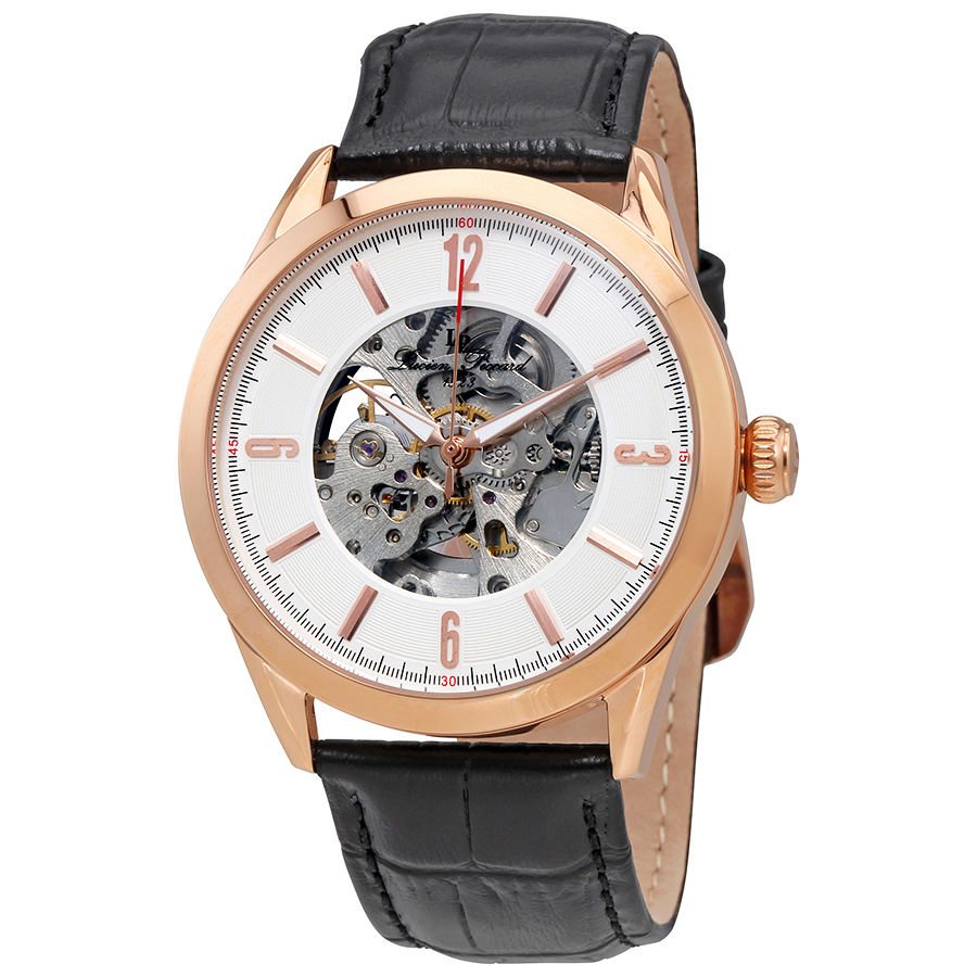 Rose gold-tone stainless steel case with a black leather strap. Fixed rose gold-tone bezel. Silver skeleton dial with luminous rose gold-tone hands and index hour markers. Arabic numerals mark the 3, 6, 9 and 12 o'clock positions. Minute markers around the outer rim. Dial Type: Analog. Luminescent hands. Automatic movement. Scratch resistant Sapphitek crystal. Transparent case back. Case size: 45 mm. Case thickness: 13 mm. Round case shape. Tang clasp. Water resistant at 50 meters / 165 feet. Functions: hour, minute, second. Casual watch style. Luien Piccard Automatic Skeleton Dial Mens Watch 10660A-RG-02S-W.