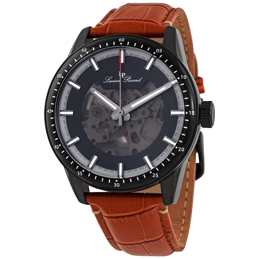 Gunmetal stainless steel case with a brown leather strap. Uni-directional rotating black stainless steel bezel. Black dial with gunmetal hands and index hour markers. Minute markers around the outer rim. Dial Type: Analog. Luminescent hands and markers. Calibre 2650SZ automatic movement with a 40-hour power reserve. Scratch resistant mineral crystal. Pull / push crown. Transparent case back. Round case shape, case size: 44 mm, case thickness: 13 mm. Band width: 22 mm. Buckle clasp. Water resistant at 50 meters / 165 feet. Functions: hour, minute, second. Dress watch style. Watch label: Chinese Movt. Lucien Piccard Automatic Black Dial Mens Watch 1297A7.