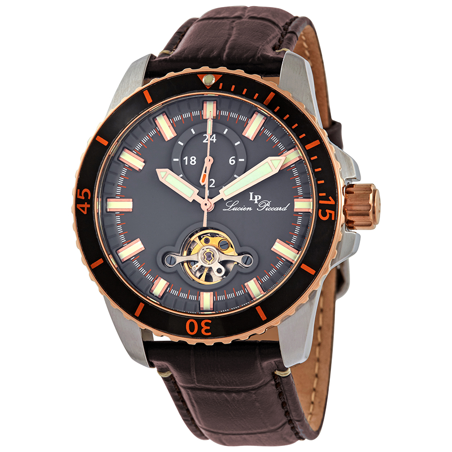 Silver-tone stainless steel case with a brown leather strap. Bi-directional rotating black with orange accents stainless steel bezel. Grey dial with gold-tone spade-shaped hands and index hour markers. Minute markers around the outer rim. Dial Type: Analog. Luminescent hands and markers. Two - 24 hour, open heart subdials. Caliber TY603K automatic movement. Scratch resistant mineral crystal. Screw down crown. Transparent case back. Round case shape, case size: 44 mm, case thickness: 13 mm. Band width: 22 mm. Buckle clasp. Water resistant at 50 meters / 165 feet. Functions: GMT, second time zone, hour, minute, second. Dive watch style. Watch label: Chinese Movt. Lucien Piccard Automatic Grey Dial Mens Watch 1298A5.