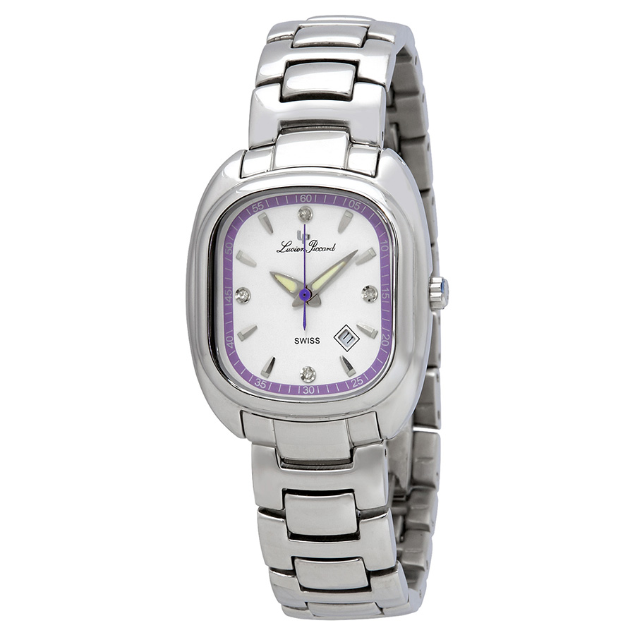 Silver-tone stainless steel case and bracelet. Fixed silver-tone bezel. White dial with luminous silver-tone hands and index hour markers. Crystals-set at the 3, 6, 9 and 12 o'clock positions. Minute markers around the outer rim. Dial Type: Analog. Luminescent hands. Date display between the 4 and 5 o'clock positions. Quartz movement. Scratch resistant sapphire crystal. Solid case back. Rectangle case shape. Deployment clasp. Water resistant at 30 meters / 100 feet. Functions: date, hour, minute, second. Dress watch style. Lucien Piccard White Dial Stainless Steel Ladies Watch 1B-067.