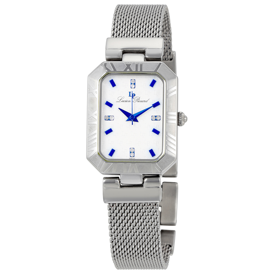 Silver-tone stainless steel case with a silver-tone stainless steel mesh bracelet. Fixed silver-tone bezel. Silver dial with blue hands and index hour markers. Crystal-set index markers at the 3, 6, 9 and 12 o'clock positions. Dial Type: Analog. Quartz movement. Scratch resistant mineral crystal. Pull / push crown. Solid case back. Rectangle case shape. Jewelry clasp. Water resistant at 30 meters / 100 feet. Functions: hour, minute, second. Dress watch style. Lucien Piccard Silver Dial Stainless Steel Mesh Ladies Watch 26944SL.