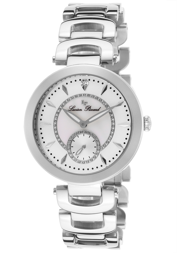 The beautiful Lucien Piccard LP-10268-22 watch features a stainless steel 36mm case, with a fixed stainless steel bezel, and a white mother of pearl crystal-set dial covered by a sapphitek crystal. The stylish wristwatch is equipped with an exclusive 18mm stainless steel which combines comfort and sturdiness. This horological trendy device has hour, minute, small second functions.