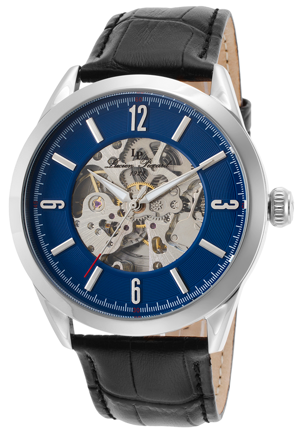 Silver-tone stainless steel case with a black leather strap. Fixed silver-tone stainless steel bezel. Blue silver skeleton dial with luminous silver-tone alpha-style shape hands and index hour markers. Arabic numerals mark the 3, 6, 9 and 12 o'clock positions. minute markers around the outer rim. Dial Type: Analog. Luminescent hands. PTS-DD2650SSZ automatic movement. Scratch resistant sapphitek crystal. Pull / push crown. Exhibition screw down case back. Round case shape, case size: 45 mm, case thickness: 13 mm. Band width: 22 mm, band length: 9 inches. Tang clasp. Water resistant at 50 meters / 165 feet. Functions: hour, minute, second. Dress watch style. Watch label: China Movt. Lucien Piccard Loft Automatic Skeleton Dial Mens Watch LP-10660A-03.