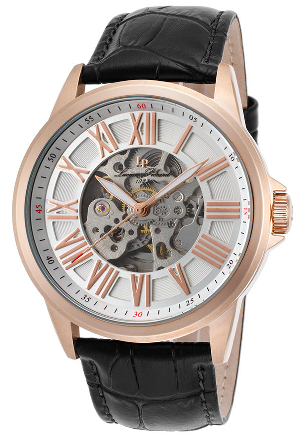 Stainless steel case with a black genuine leather strap. Fixed bezel. Silver-tone dial with rose-tone and luminous hour and minute. rose-tone and red second hands and Roman numerals hour markers. Minute markers around the outer rim. Dial Type: Analog. Luminescent hands. PST Caliber PST-2650 automatic movement. Scratch resistant sapphitek crystal. Push/pull crown. Exhibition screw-down case back. Case size: 45 mm. Case thickness: 14 mm. Round case shape. Band width: 22 mm. Band length: 9 inches. Buckle clasp. Water resistant at 50 meters / 165 feet. Functions: hour, minute, second. Dress watch style. Watch label: China Movt. Lucien Piccard Calypso Automatic Mens Watch LP-12683A-RG-02S.