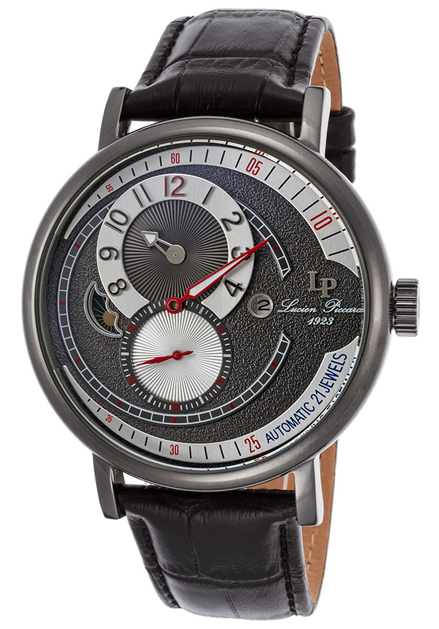 Black ion-plated stainless steel case with a black leather strap. Fixed black ion-plated bezel. Charcoal silver-tone dial with red minute hand, silver-tone and hour hand, red second hand hands and Arabic numeral hour markers. Minute markers. Dial Type: Analog. Luminescent hands. Date display at the 3 o'clock position. Chronograph - sub-dials displaying: three - minute, second, moonphase. Caliber DG3806EB-3D automatic movement. Scratch resistant sapphitek crystal. Pull / push crown. Transparent screw down case back. Case size: 45 mm. Case thickness: 14 mm. Round case shape. Band width: 20 mm. Band length: 8.75 inches. Fold over deployment clasp. Water resistant at 50 meters / 165 feet. Functions: date, hour, minute, second, moonphase. Dress watch style. Watch label: China Movt. Lucien Piccard Supernova Moonphase Automatic Mens Watch LP-15157-GM-01.