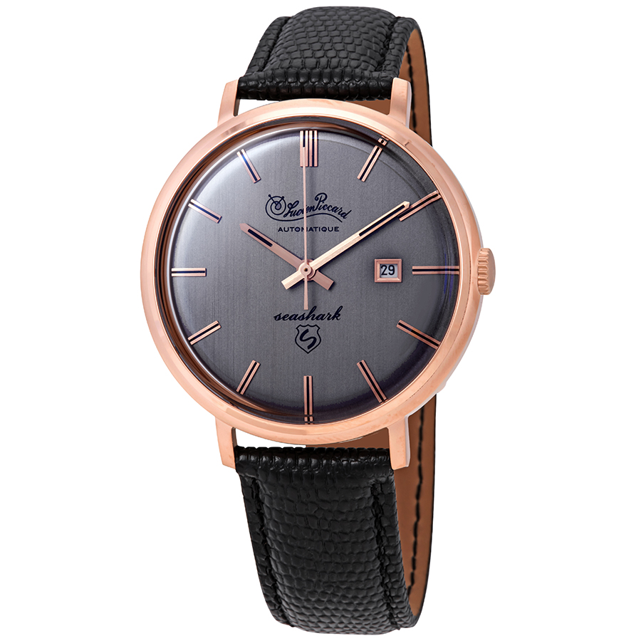 Ip rose gold stainless steel case with a black leather strap. Fixed IP rose gold stainless steel bezel. Grey dial with rose gold hands. Dial Type: Analog. Date display at the 3 o'clock position. Miyota Caliber 8215 automatic movement with a 42-hour power reserve. Scratch resistant mineral crystal. Pull / push crown. Transparent case back. Round case shape, case size: 44 mm, case thickness: 11.9 mm. Band width: 20 mm, band length: 8.25 inches. Strap type clasp. Water resistant at 50 meters / 165 feet. Functions: date, hour, minute, second. Casual watch style. Watch label: Japan Movt. Lucien Piccard Seashark Grey Dial Mens Watch LP-18115-RG-04.