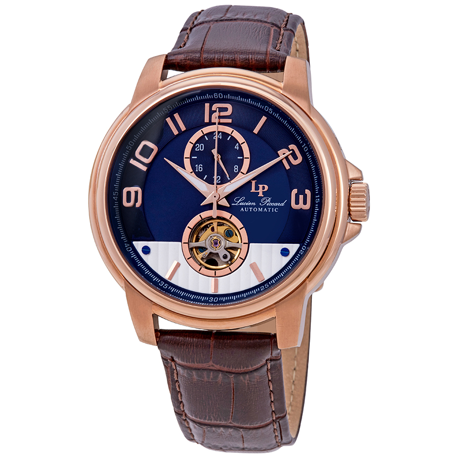 Rose gold-tone stainless steel case with a brown leather strap. Fixed rose gold-tone stainless steel bezel. Blue dial with rose gold-tone dauphine-style shape hands and Arabic numeral hour markers. Minute markers around the outer rim. Dial Type: Analog. Luminescent no. Two - 24 hour, open heart subdials. Caliber TY603K automatic movement. Scratch resistant mineral crystal. Pull / push crown. Stainless steel case back. Round case shape, case size: 47 mm, case thickness: 15.2 mm. Band width: 22 mm, band length: 8 inches. Tang clasp. Water resistant at 50 meters / 165 feet. Functions: GMT, second time zone, hour, minute, second. Casual watch style. Lucien Piccard Open Heart Automatic Blue Dial Mens Watch LP-28001A-RG-03-BRW.