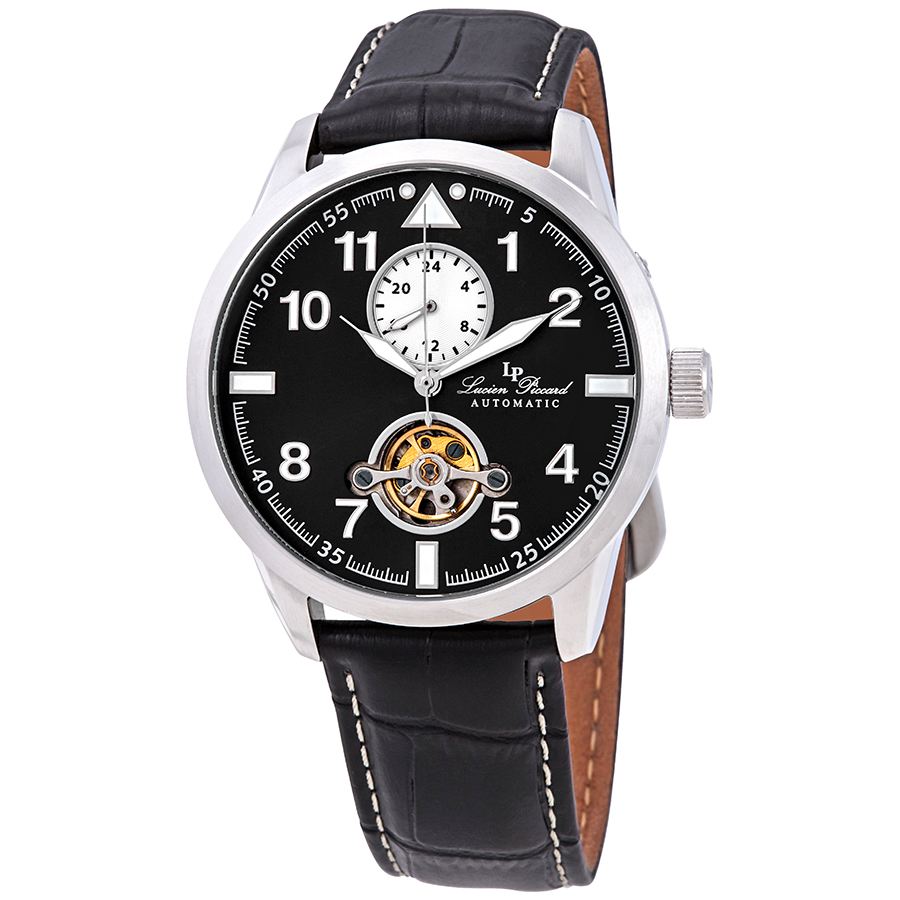 Silver-tone stainless steel case with a black leather strap. Fixed silver-tone stainless steel bezel. Black dial with silver-tone hands and Arabic numeral hour markers. Minute markers around the outer rim. Dial Type: Analog. Luminescent hands and markers. Two - 24 hour, open heart subdials. Caliber TY603K automatic movement. Scratch resistant mineral crystal. Pull / push crown. Stainless steel case back. Round case shape, case size: 44 mm, case thickness: 14.1 mm. Band width: 20 mm, band length: 8 inches. Tang clasp. Water resistant at 50 meters / 165 feet. Functions: GMT, second time zone, hour, minute, second. Casual watch style. Lucien Piccard Lodestar Auto GMT Automatic Black Dial Mens Watch LP-28008A-01.