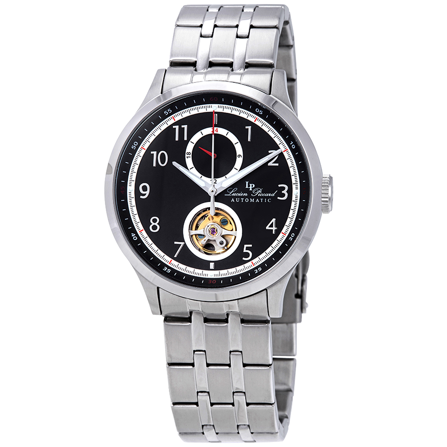 Silver-tone stainless steel case with a silver-tone stainless steel bracelet. Fixed silver-tone stainless steel bezel. Black dial with silver-tone hands and Arabic numeral hour markers. Minute markers around the outer rim. Dial Type: Analog. Luminescent hands and markers. Two - 24 hour, open heart subdials. Caliber TY603K automatic movement. Scratch resistant mineral crystal. Pull / push crown. Transparent case back. Round case shape, case size: 44 mm, case thickness: 14 mm. Band width: 22 mm, band length: 8.6 inches. Security type clasp. Water resistant at 50 meters / 165 feet. Functions: GMT, second time zone, hour, minute, second. Sport watch style. Lucien Piccard Open Heart GMT II Automatic Black Dial Mens Watch LP-28010A-11.