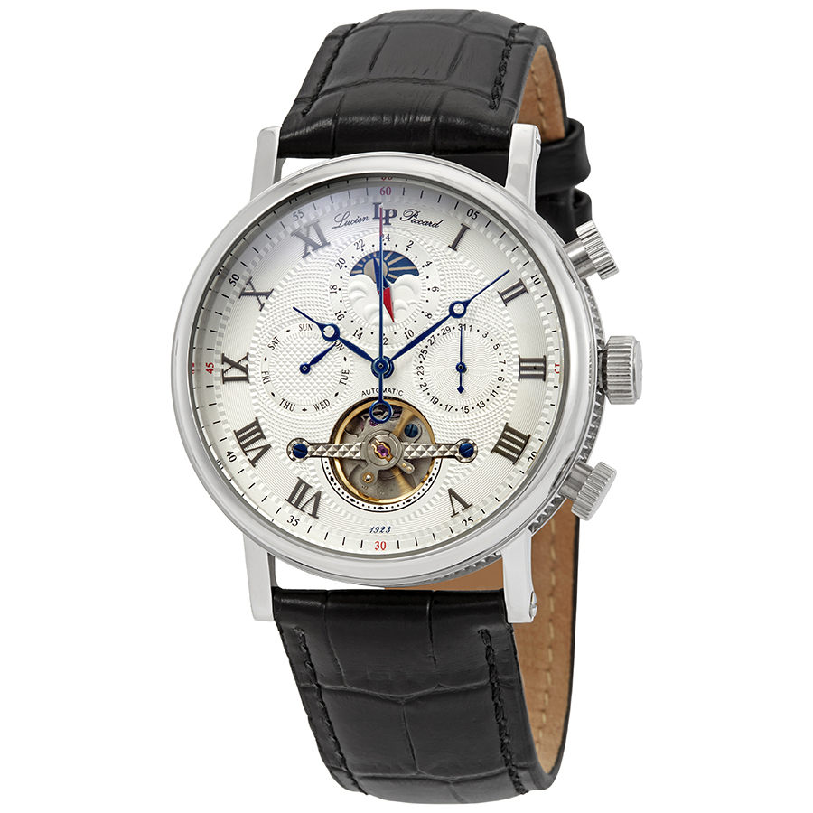 Stainless steel case with a black (calfskin) leather strap. Fixed stainless steel bezel. Silver dial ( with a skeletal display) with metallic blue hands and Roman numeral hour markers. Minute markers around the outer rim. Dial Type: Analog. Date display at the 3 o'clock position. Three multi-function sub-dials displaying: 24 hour, date and day of the week. Day / night display. Caliber H3006 automatic movement. Scratch resistant Sapphitek crystal. Pull / push crown. Transparent screw down case back. Round case shape. Case size: 44 mm. Case thickness: 16 mm. Band width: 22 mm. Band length: 9 inches. Fold over deployment clasp. Water resistant at 30 meters / 100 feet. Functions: date, day, GMT, second time zone, hour, minute, second, day/night indicator. Additional Info: open heart windows at the 6 o'clock position. Dress watch style. Watch label: China Movt. Lucien Piccard Ottoman Day-Night Automatic Mens Watch LP-40012A-02S.