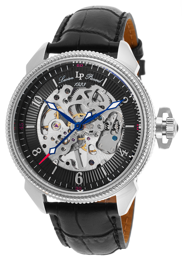 Stainless steel case with a black leather strap. Fixed stainless steel bezel. Black silver skeleton dial with luminous blue hands and Arabic numerals and index hour markers. Minute markers around the outer rim. Dial Type: Analog. Luminescent hands. Caliber SK2610 hand wind movement. Scratch resistant sapphitek crystal. Pull / push crown. Transparent screw down case back. Case size: 44 mm. Case thickness: 13 mm. Round case shape. Band width: 20 mm. Band length: 9 inches. Deployment clasp. Water resistant at 30 meters / 100 feet. Functions: hour, minute, second. Dress watch style. Watch label: China Movt. Lucien Piccard Trevi Mechanical Mens Watch LP-40052M-01.