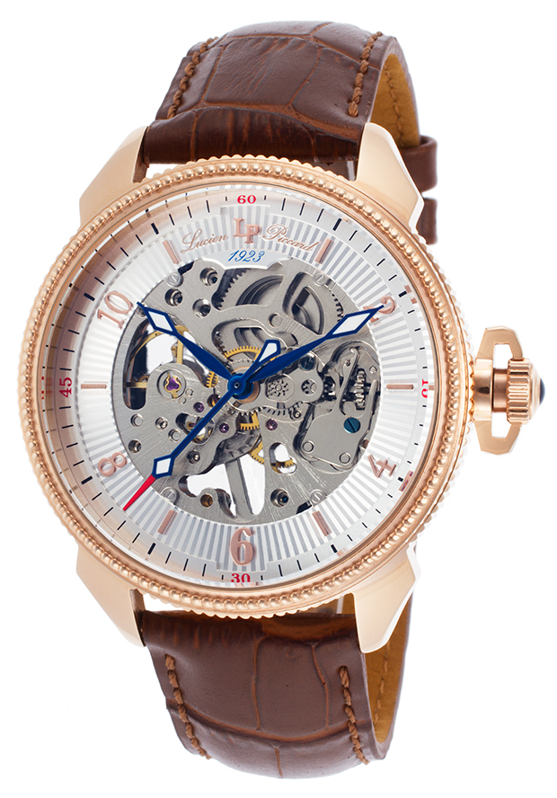 Stainless steel case with a brown genuine leather strap. Silver-tone dial with blue and luminous hour and minute hands. blue, luminous and red second hand. hands and Arabic numerals and indices hour markers. Dial Type: Analog. Luminescent hands. Caliber SK2610 hand wind movement. Scratch resistant sapphitek crystal. Push/pull crown. Exhibition screw-down case back. Case size: 44 mm. Case thickness: 13 mm. Round case shape. Band width: 20 mm. Band length: 9 inches. Buckle deployment clasp. Water resistant at 30 meters / 100 feet. Functions: hour, minute, second. Dress watch style. Watch label: China Movt. Lucien Piccard Trevi Mechanical Mens Watch LP-40052M-RG-02S-BRW.