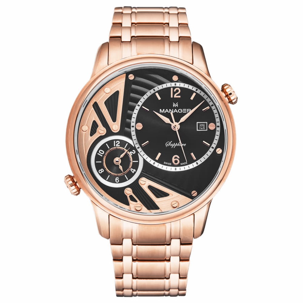 Rose gold-tone stainless steel case and bracelet. Fixed rose gold-tone stainless steel bezel. Black dial with rose gold-tone hands and Arabic numeral & index hour markers. Minute markers around the outer rim. Dial Type: Analog. Date display at the 3 o'clock position. Quartz movement. Scratch resistant sapphire crystal. Pull / push crown. Solid case back. Round case shape, case size: 43 mm, case thickness: 11 mm. Band width: 22 mm, band length: 8 inches. Deployment with push button release clasp. Water resistant at 50 meters / 165 feet. Functions: date, hour, minute, second. Additional Info: hour, minute, second, date, second time zone. Nomad Series. Luxury watch style. Watch label: Swiss Made. Manager Nomad Quartz Black Dial Mens Watch MAN-TR-05-RM.