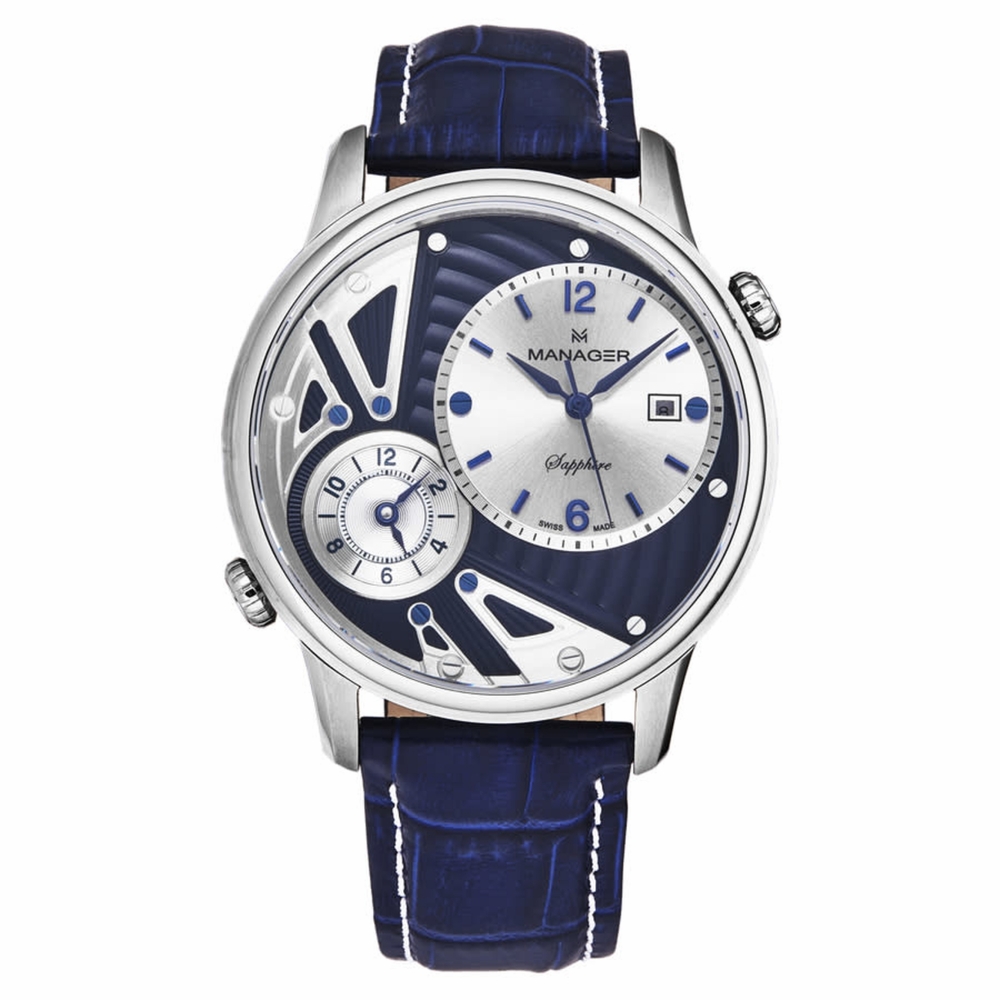 Silver-tone stainless steel case with a blue leather strap. Fixed silver-tone stainless steel bezel. Silver-tone dial with blue hands and Arabic numeral & index hour markers. Minute markers around the outer rim. Dial Type: Analog. Date display at the 3 o'clock position. Quartz movement. Scratch resistant sapphire crystal. Pull / push crown. Solid case back. Round case shape, case size: 44 mm, case thickness: 12 mm. Band width: 22 mm, band length: 8 inches. Tang clasp. Water resistant at 50 meters / 165 feet. Functions: date, hour, minute, second. Additional Info: hour, minute, second, date, second time zone. Nomad Series. Luxury watch style. Manager Nomad Quartz Silver Dial Mens Watch MAN-TR-01-SL.