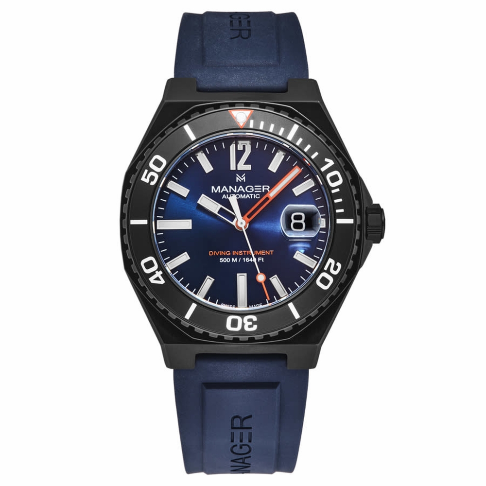 Black stainless steel case with a blue rubber strap. Uni-directional rotating black stainless steel bezel. Blue dial with silver-tone hands and index hour markers. Minute markers around the outer rim. Dial Type: Analog. Luminescent hands and markers. Date display at the 3 o'clock position. Automatic movement. Scratch resistant sapphire crystal. Screw down crown. Solid case back. Round case shape, case size: 44 mm, case thickness: 14 mm. Band width: 23.5 mm, band length: 8 inches. Deployment with push button release clasp. Water resistant at 500 meters / 1650 feet. Functions: date, hour, minute, second. Additional Info: hour, minute, second & date. Oceana Series. Luxury watch style. Watch label: Swiss Made. Manager Oceana Automatic Blue Dial Mens Watch MAN-RD-02-NC.