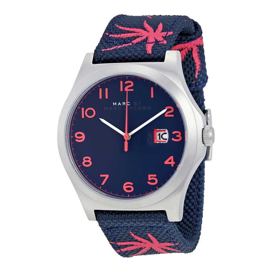 Silver-tone stainless steel case with a blue nylon strap. Fixed silver-tone stainless steel bezel. Blue dial with white hands and Arabic numeral hour markers. Minute markers around the outer rim. Dial Type: Analog. Date display at the 3 o'clock position. Quartz movement. Scratch resistant mineral crystal. Pull / push crown. Solid case back. Round case shape, case size: 42 mm, case thickness: 11 mm. Band width: 22 mm, band length: 8 inches. Tang clasp. Water resistant at 50 meters / 165 feet. Functions: date, hour, minute, second. Casual watch style. Marc By Marc Jacobs Jimmy Quartz Blue Dial Ladies Watch MBM5087.