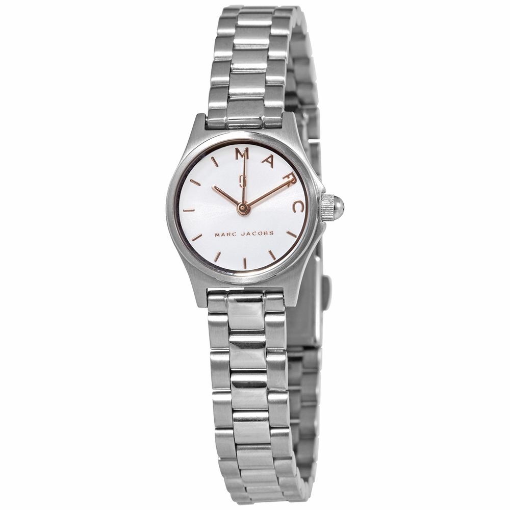 Silver-tone stainless steel case and bracelet. Fixed bezel. White dial with rose gold-tone hands and index hour markers. Dial Type: Analog. Quartz movement. Scratch resistant mineral crystal. Pull / push crown. Solid case back. Round case shape, case size: 26 mm. Water resistant at 50 meters / 165 feet. Functions: hour, minute, second. Henry Series. Casual watch style. Marc Jacobs Henry Quartz White Dial Ladies Watch MJ3586.