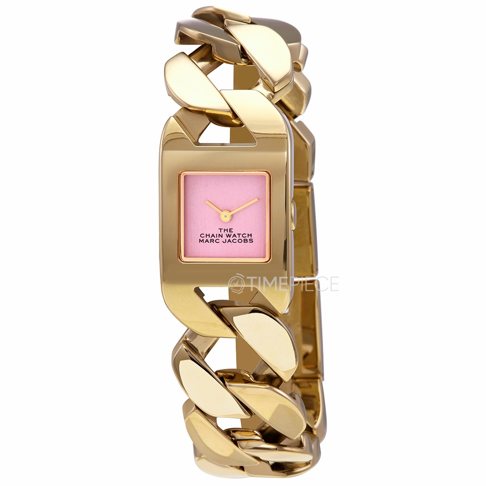 Gold-tone stainless steel case and bracelet. Fixed gold-tone bezel. Pink dial with gold-tone hands. No markers. Dial Type: Analog. Quartz movement. Scratch resistant mineral crystal. Pull / push crown. Solid case back. Round case shape. Case size: 22 mm. Case thickness: 8 mm. Band width: 22 mm. Jewelry clasp. Water resistant at 30 meters / 100 feet. Functions: hour, minute. The Chain Series. Dress watch style. Marc Jacobs The Chain Quartz Pink Dial Ladies Watch MJ0120179310.