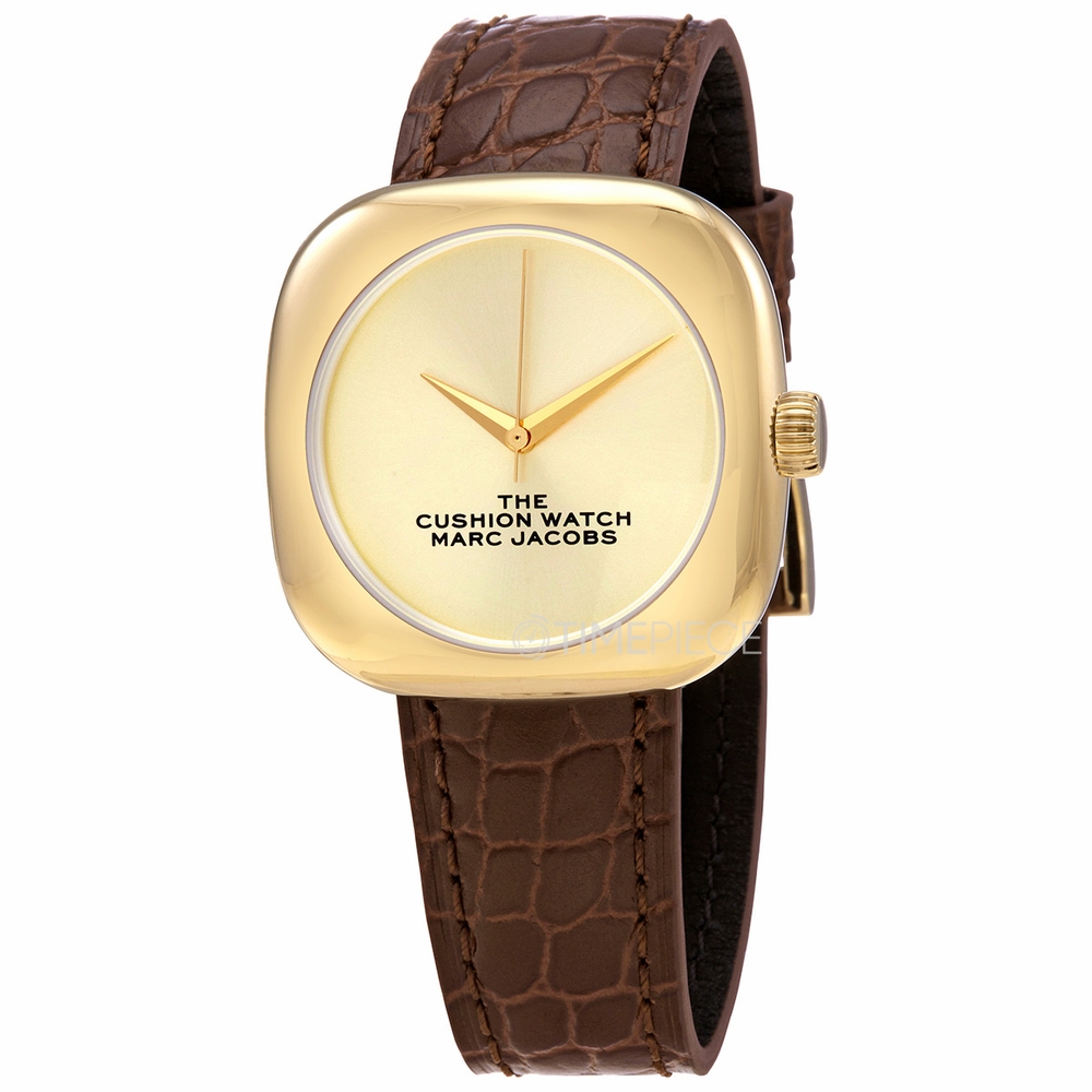 Gold PVD stainless steel case with a brown leather strap. Fixed gold PVD bezel. Champagne dial with gold-tone hands. No markers. Dial Type: Analog. Quartz movement. Scratch resistant mineral crystal. Pull / push crown. Solid case back. Square case shape. Case size: 36 mm. Case thickness: 10 mm. Band width: 20 mm. Tang clasp. Water resistant at 30 meters / 100 feet. Functions: hour, minute, second. The Cushion Series. Casual watch style. Marc Jacobs The Cushion Quartz Champagne Dial Ladies Watch MJ0120179305.