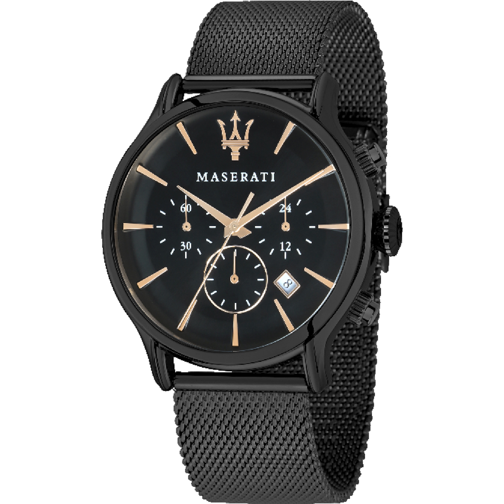 Black stainless steel case with a black stainless steel mesh bracelet. Fixed black stainless steel bezel. Black dial with rose gold-tone hands and index hour markers. Dial Type: Analog. Date display between 4 and 5 o'clock position. Chronograph - three sub-dials displaying: 60 second, 60 minute and 24 hour. Hattori Caliber VD53 quartz movement. Scratch resistant mineral crystal. Screw down crown. Solid case back. Round case shape, case size: 42 mm, case thickness: 12 mm. Band width: 21 mm. Water resistant at 100 meters / 330 feet. Functions: chronograph, date, hour, minute, second. Casual watch style. Watch label: Japan Movt. Maserati Epoca Chronograph Black Dial Mens Watch R8873618006.