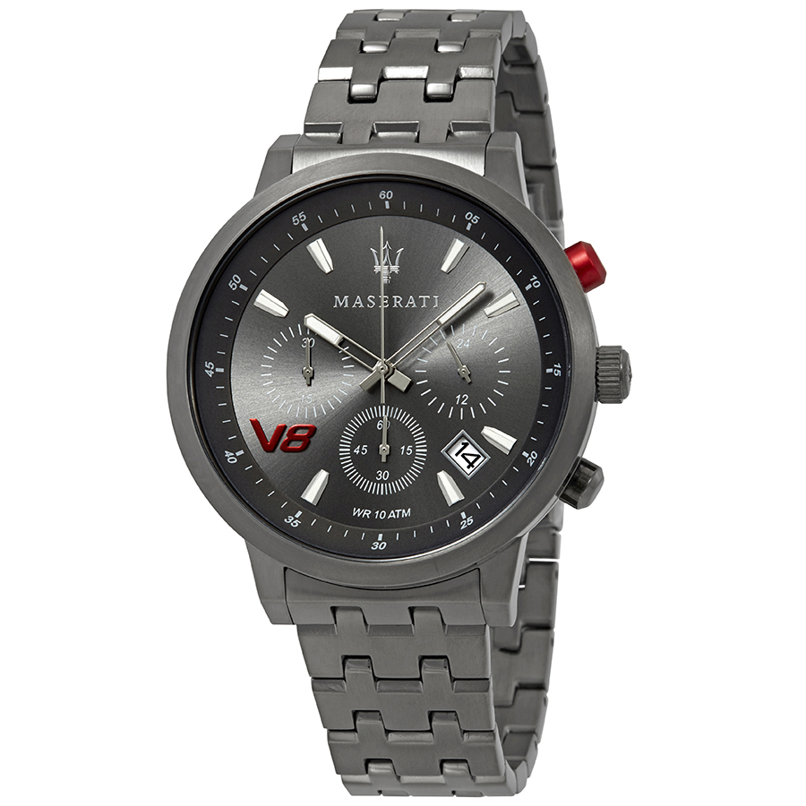 Grey PVD stainless steel case and bracelet. Fixed grey PVD bezel. Grey dial with luminous grey hands and index hour markers. Minute markers around the outer rim. Dial Type: Analog. Luminescent hands and markers. Date display between the 4 and 5 o'clock positions. Chronograph - three sub-dials displaying: 60 second, 30 minute and 24 hour. SHIOJIRI caliber VR32 quartz movement. Scratch resistant mineral crystal. Pull / push crown. Solid case back. Round case shape. Case size: 44 mm. Case thickness: 11.7 mm. Band width: 20 mm. Fold over clasp with a push button release. Water resistant at 100 meters / 330 feet. Functions: chronograph, date, hour, minute, second. Granturismo Series. Sport watch style. Watch label: Japan Movt. Maserati Granturismo Chronograph Grey Dial Mens Watch R8873134001.