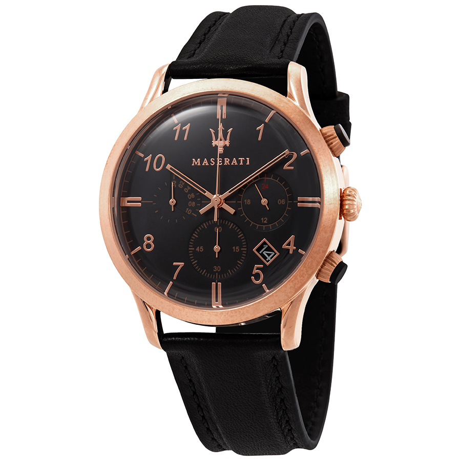 Rose gold-tone stainless steel case with a black leather strap. Fixed rose gold-tone stainless steel bezel. Black dial with rose gold-tone hands and Arabic numeral and index hour markers. Minute markers around the outer rim. Dial Type: Analog. Date display between 4 and 5 o'clock position. Chronograph - three sub-dials displaying: 60 second, 30 minute and 24hour. SHIOJIRI Caliber VR32 quartz movement. Scratch resistant mineral crystal. Pull / push crown. Solid case back. Round case shape, case size: 42 mm, case thickness: 12.4 mm. Band width: 21 mm. Buckle clasp. Water resistant at 50 meters / 165 feet. Functions: chronograph, date, GMT, second time zone, hour, minute, second. Dress watch style. Watch label: Japan Movt. Maserati Ricordo Chronograph Black Dial Mens Watch R8871625004.