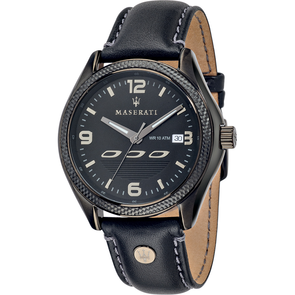 Black ion-plated stainless steel case with a black leather strap. Fixed black ion-plated bezel. Black dial with luminous silver-tone hands and index hour markers. Arabic numerals mark the 3, 6, 9 and 12 o'clock positions. Minute markers around the outer rim. Dial Type: Analog. Luminescent hands. Date display at the 3 o'clock position. SII caliber VJ52 quartz movement. Scratch resistant mineral crystal. Screw down crown. Solid case back. Round case shape. Case size: 45 mm. Case thickness: 11.6 mm. Band width: 22 mm. Tang clasp. Water resistant at 100 meters / 330 feet. Functions: date, hour, minute, second. Casual watch style. Watch label: Japan Movt. Maserati Sorpasso Black Dial Black Leather Mens Watch R8851124001.