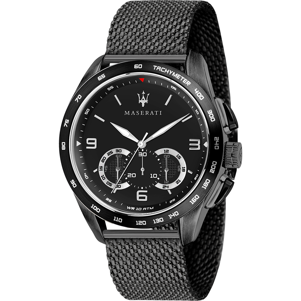 Black stainless steel case with a black stainless steel milanese mesh bracelet. Fixed with engraved tachymeter black stainless steel bezel. Black dial with silver-tone hands and Arabic numeral and index hour markers. Minute markers around the outer rim. Dial Type: Analog. Luminescent hands and markers. Chronograph - three sub-dials displaying: 60 second, 30 minute and 24 hour. Miyota Caliber JS50 quartz movement. Scratch resistant mineral crystal. Screw down crown. Solid case back. Round case shape, case size: 45 mm, case thickness: 13 mm. Band width: 22 mm. Milanese clasp. Water resistant at 100 meters / 330 feet. Functions: chronograph, GMT, second time zone, hour, minute, second. Casual watch style. Watch label: Japan Movt. Maserati Traguardo Chronograph Quartz Black Dial Mens Watch R8873612031.