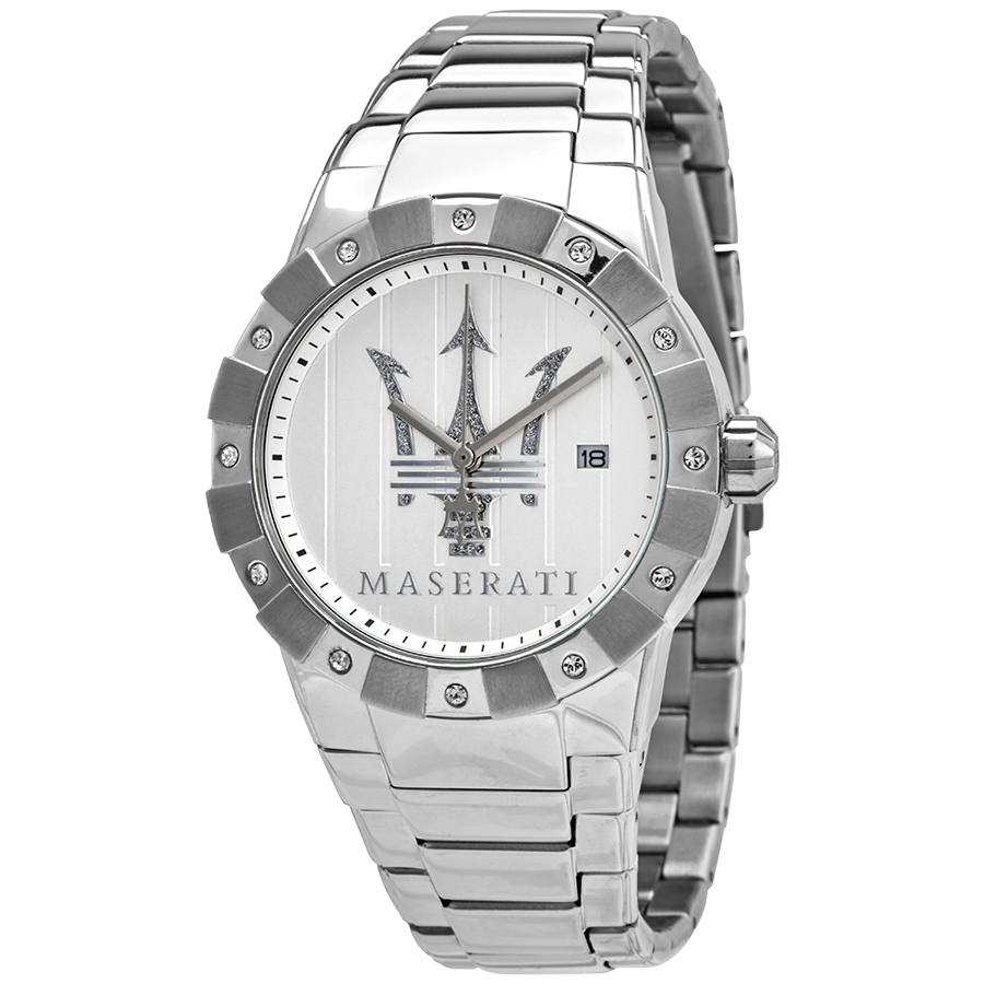 Silver-tone stainless steel case with a silver-tone stainless steel bracelet. Fixed silver-tone stainless steel bezel. Silver dial with silver-tone hands and index hour markers. Minute markers around the outer rim. Dial Type: Analog. Date display at the 3 o'clock position. Miyota Caliber 2115 quartz movement. Scratch resistant mineral crystal. Pull / push crown. Solid case back. Round case shape. Case size: 38 mm. Hidden clasp. Water resistant at 100 meters / 330 feet. Functions: date, hour, minute, second. Casual watch style. Watch label: Japan Movt. Maserati Tridente Quartz Silver Dial Ladies Watch R8853103501.