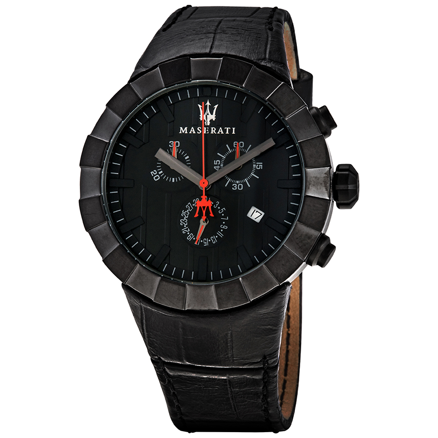 Black stainless steel case with a black leather strap. Fixed black bezel. Black dial with black hands and index hour markers. Dial Type: Analog. Dual date. Quartz movement. Scratch resistant mineral crystal. Pull / push crown. Solid case back. Round case shape. Case size: 44 mm. Band width: 22 mm. Water resistant at 100 meters / 330 feet. Functions: chronograph, date, hour, minute, second. Maserati Chronograph Quartz Black Dial Mens Watch R8871603001.