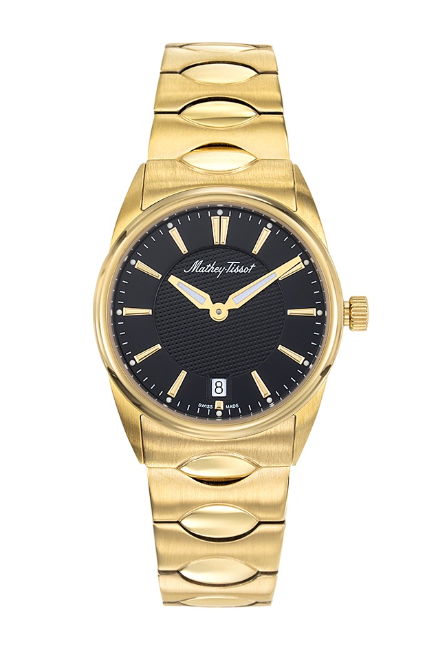 Yellow gold-tone stainless steel case and bracelet. Fixed yellow gold-tone stainless steel bezel. Black dial with yellow gold-tone hands and index hour markers. Minute markers around the outer rim. Dial Type: Analog. Luminescent hands and markers. Date display at the 6 o'clock position. Ronda Caliber 714 quartz movement. Scratch resistant mineral crystal. Pull / push crown. Solid case back. Round case shape, case size: 32 mm. Deployment with push button release clasp. Water resistant at 50 meters / 165 feet. Functions: date, hour, minute, second. Anaconda Series. Casual watch style. Watch label: Swiss Made. Mathey-Tissot Anaconda Quartz Black Dial Ladies Watch D791PN.