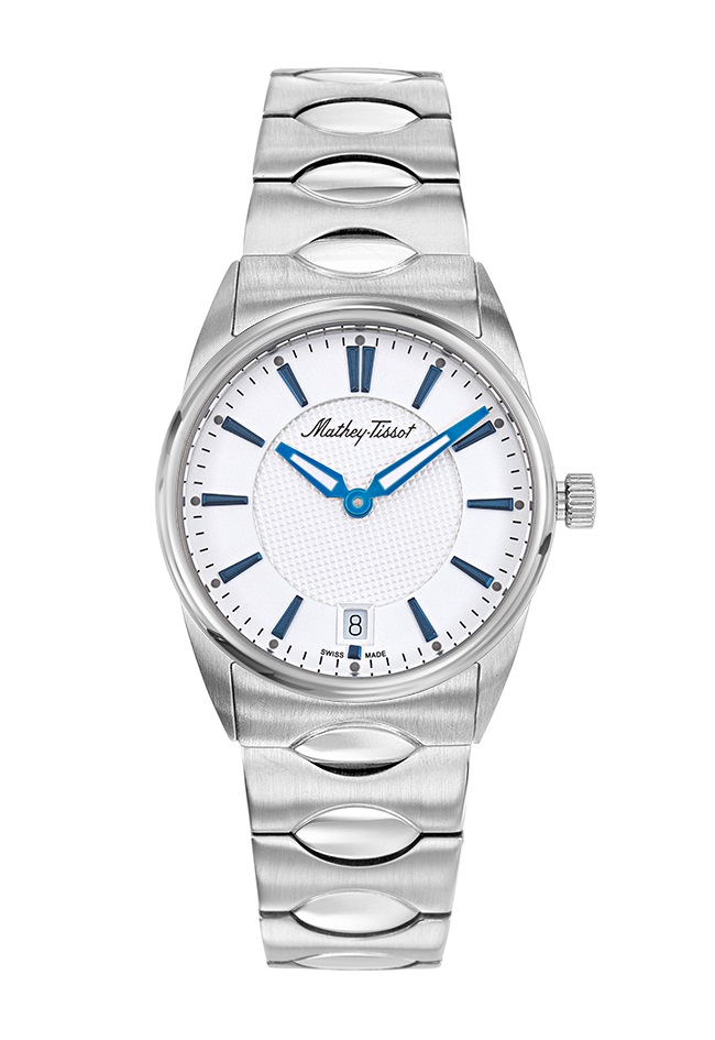 Silver-tone stainless steel case and bracelet. Fixed silver-tone stainless steel bezel. White dial with blue hands and index hour markers. Minute markers around the outer rim. Dial Type: Analog. Luminescent hands and markers. Date display at the 6 o'clock position. Ronda Caliber 714 quartz movement. Scratch resistant mineral crystal. Pull / push crown. Solid case back. Round case shape, case size: 32 mm. Deployment with push button release clasp. Water resistant at 50 meters / 165 feet. Functions: date, hour, minute, second. Anaconda Series. Casual watch style. Watch label: Swiss Made. Mathey-Tissot Anaconda Quartz White Dial Ladies Watch D791AI.