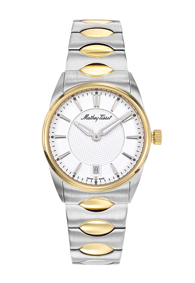 Silver-tone stainless steel case with a two-tone (silver-tone and yellow gold-tone) stainless steel bracelet. Fixed yellow gold-tone stainless steel bezel. White dial with silver-tone hands and index hour markers. Minute markers around the outer rim. Dial Type: Analog. Luminescent hands and markers. Date display at the 6 o'clock position. Ronda Caliber 714 quartz movement. Scratch resistant mineral crystal. Pull / push crown. Solid case back. Round case shape, case size: 32 mm. Deployment with push button release clasp. Water resistant at 50 meters / 165 feet. Functions: date, hour, minute, second. Anaconda Series. Casual watch style. Watch label: Swiss Made. Mathey-Tissot Anaconda Quartz White Dial Ladies Watch D791BI.
