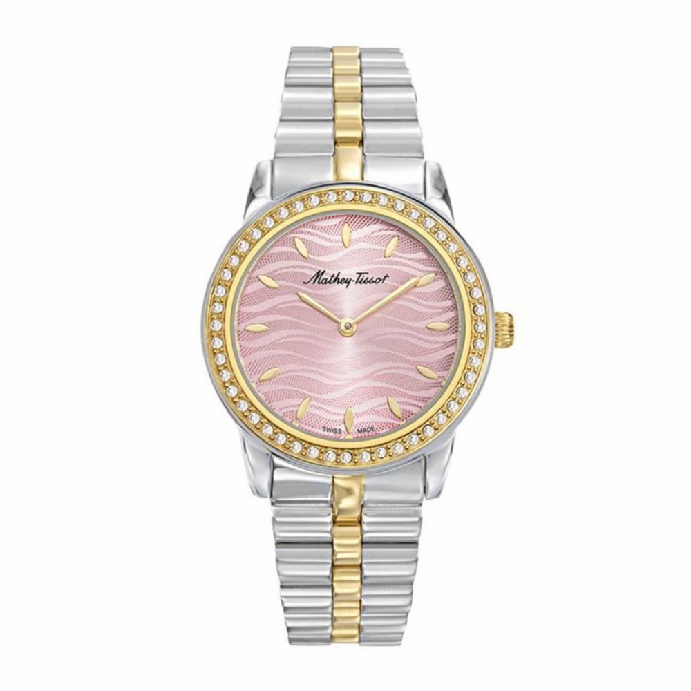 Stainless steel case with a two-tone (silver-tone and yellow gold PVD) stainless steel bracelet. Fixed yellow gold PVD bezel set with zirconia crystals. Pink dial with yellow gold-tone hands and index hour markers. Dial Type: Analog. Ronda 1062 quartz movement. Scratch resistant sapphire coated crystal. Pull / push crown. Solid case back. Round case shape. Case size: 32 mm. Butterfly clasp. Water resistant at 30 meters / 100 feet. Functions: hour, minute. Artemis Series. Casual watch style. Watch label: Swiss Made. Mathey-Tissot Artemis Quartz Pink Dial Ladies Watch D10860BQYPK.