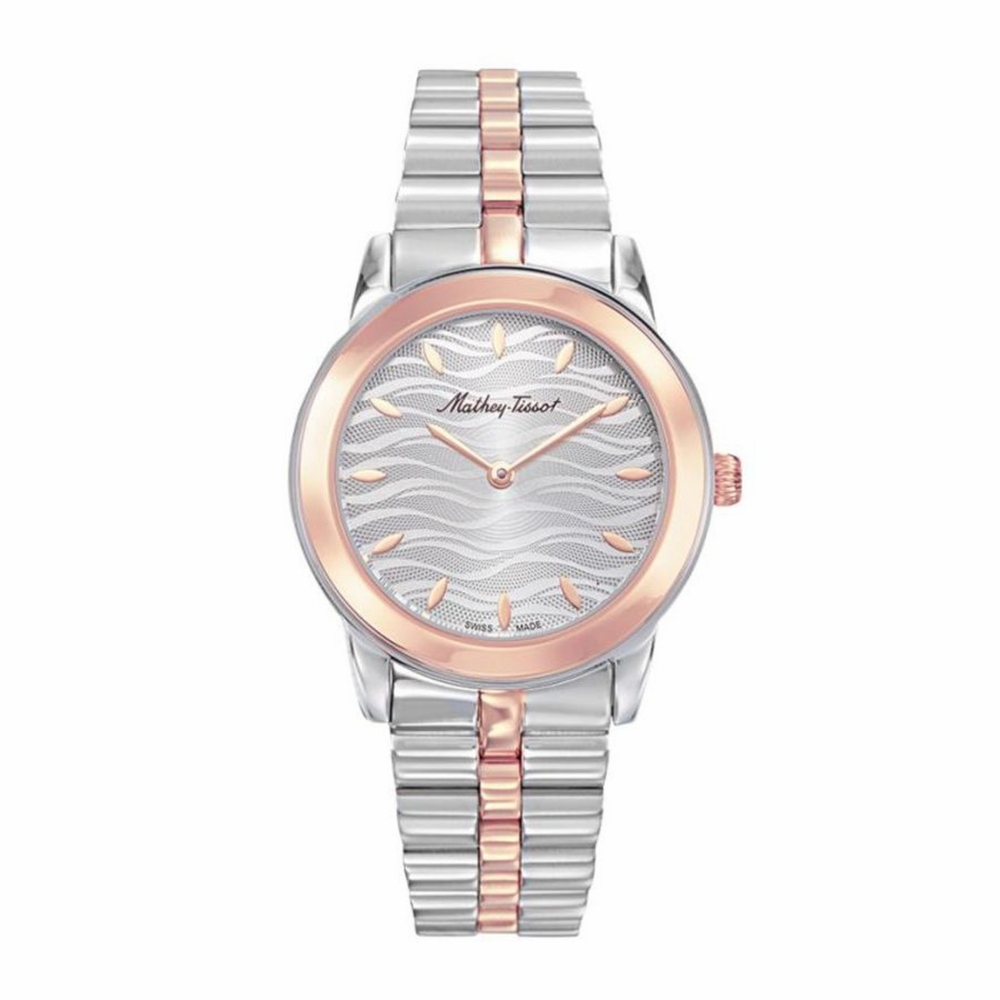 Stainless steel case with a two-tone (silver-tone and rose gold PVD) stainless steel bracelet. Fixed rose gold PVD bezel. Silver dial with rose gold-tone hands and index hour markers. Dial Type: Analog. Ronda caliber 1062 quartz movement. Scratch resistant sapphire coated crystal. Pull / push crown. Solid case back. Round case shape. Case size: 32 mm. Butterfly clasp. Water resistant at 30 meters / 100 feet. Functions: hour, minute. Artemis Series. Dress watch style. Watch label: Swiss Made. Mathey-Tissot Artemis Quartz Silver Dial Ladies Watch D10860BS.