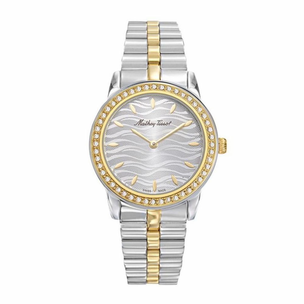 Stainless steel case with a two-tone (silver-tone and yellow gold PVD) stainless steel bracelet. Fixed yellow gold PVD bezel set with zirconia crystals. Silver dial with yellow gold-tone hands and index hour markers. Dial Type: Analog. Ronda caliber 1062 quartz movement. Scratch resistant mineral crystal. Pull / push crown. Solid case back. Round case shape. Case size: 32 mm. Butterfly clasp. Water resistant at 50 meters / 165 feet. Functions: hour, minute. Additional Info: zirconia. Artemis Series. Casual watch style. Watch label: Swiss Made. Mathey-Tissot Artemis Quartz Silver Dial Ladies Watch D10860BQYS.